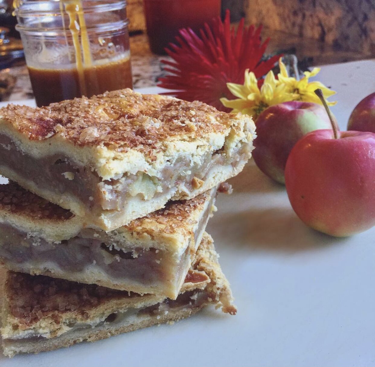 - While the pie is cooling, in a small saucepan over low heat, melt the butter and maple syrup together. Once the butter has melted, remove from heat and whisk in the sifted icing sugar. Add a pinch of salt if desired. Allow glaze to cool for 10 minutes. Use a spoon to drizzle glaze over cooled apple pie squares.